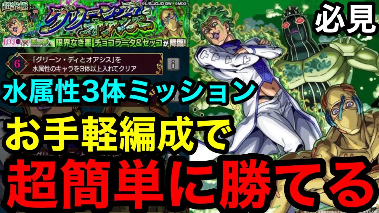 【モンストジョジョコラボ】超究極チョコラータ水属性3体ミッションの攻略動画です。お手軽編成で水属性ミッションを超簡単に勝てるので興味がある方はぜひ観てください。