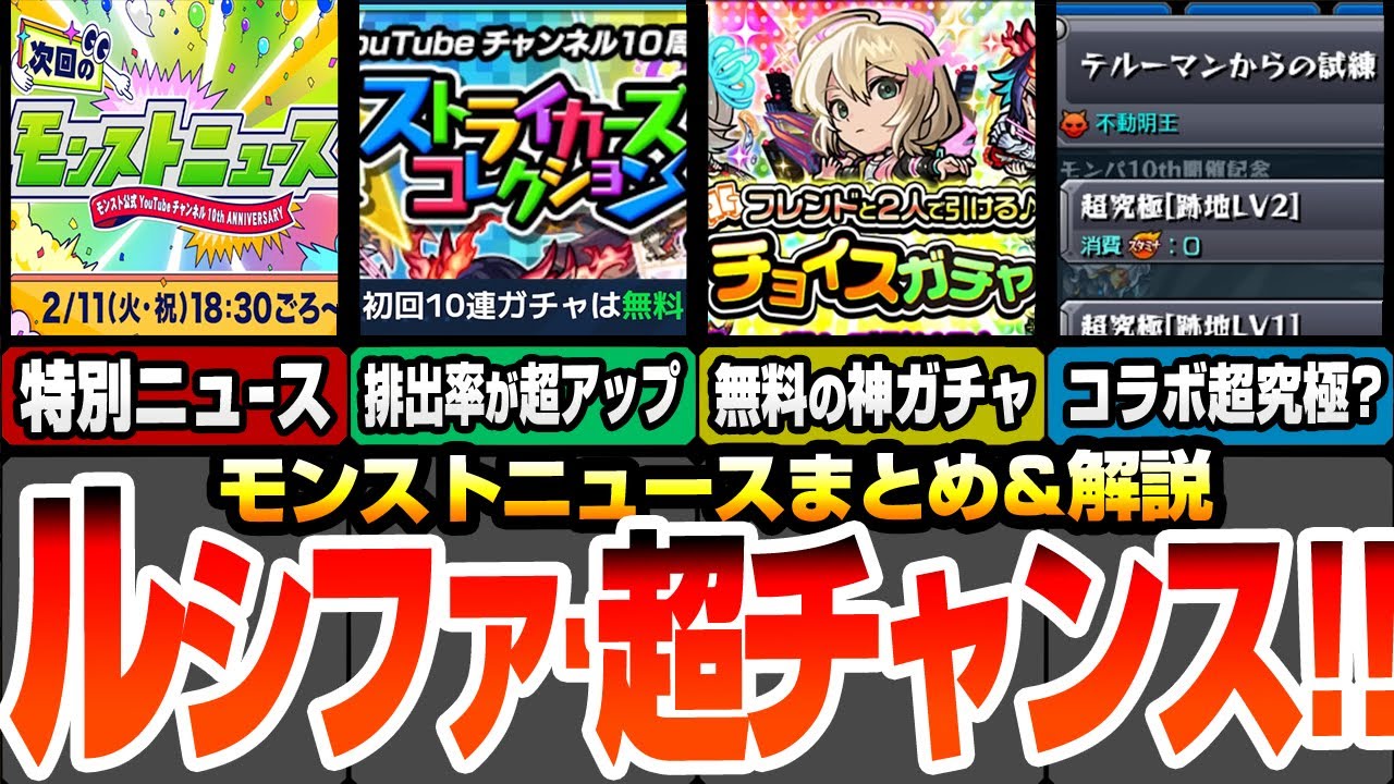 【モンスト】初回10連無料!ルシファー引く超チャンス!ストライカーズコレクションで排出率超アップ!無料でフレンド2人で引けるチョイスガチャも来る!モンパで特別ニュース来るぞ!【へっぽこストライカー】