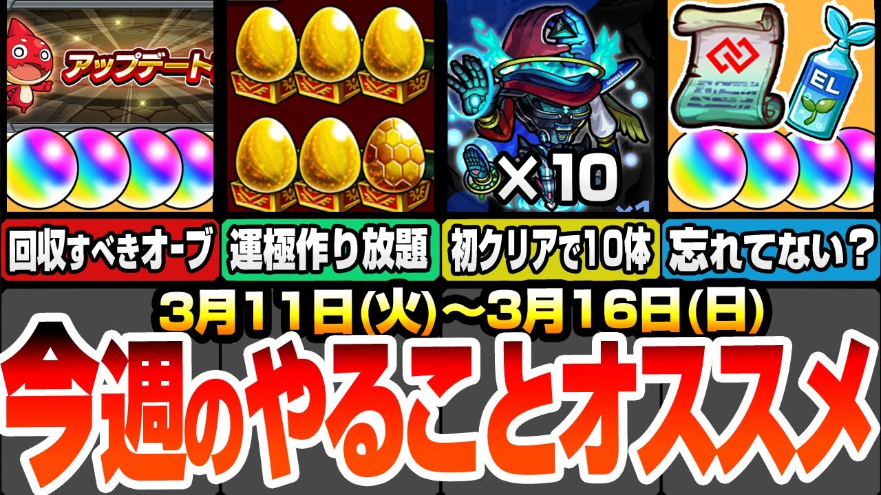 今週のやることまとめ!モンストニュースでコラボ発表来るか?コラボ開始は〇〇日が濃厚か?アップデートで細かいオーブあり!新黎絶デティアカルが1回クリアで10体貰える期間限定ミッションあり!けしモンを全てクリアして無料でオールスター感謝ガチャを50連しよう!