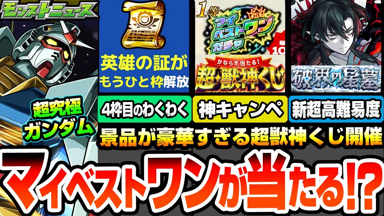 モンストニュースで発表!超・獣神くじで豪華賞品が当たる!マイベストワンガチャやマイベストテンガチャが当たる!?ハズレても経験値たんまりタスの巣窟チケで大量経験値ゲット!破界の星墓の詳細判明!大英雄の書で第4のわくわくの実がつけられる!超機動戦士Gundam GQuuuuuuXコラボ開催!ガンダムコラボきた!超究極シュウジ・イトウ&ガンダムきた!ハロガチャダブルチャンスで戦型の書をゲット!マヴ効果が書庫と守護獣の全クエで発動可能に!絆のカケラを集める超チャンス!アマテ・ユズリハ(マチュ)は弱点必中ワンパンSS!ニャアンは禁忌深淵光獄をワンパン!シュウジ・イトウは未来型!スターターパックはシャア・アズナブル!M.A.V.ミッションで経験値40倍、金卵排出率1.5倍!コラボ第1弾、第2弾、SEEDの復刻もある!