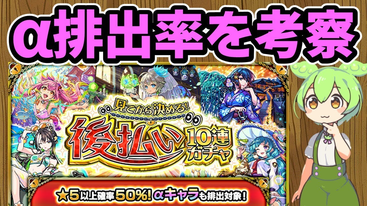 モンストガチャ「見てから決める!後払い10連ガチャ」第3週の「星5以上確率50%αキャラも排出対象ガチャ」について、α排出率、50オーブを使う基準などを徹底考察しました