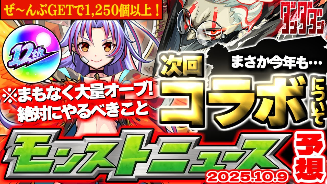 【モンスト】※期限迫る!大量オーブ獲得チャンス前に絶対やるべきことも…ダンダダンコラボや12周年関連イベントの運命やいかに!【去年の振り返り&明日のモンストニュース[10/9]予想】