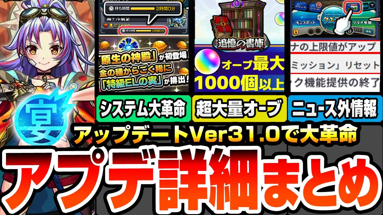 【モンスト】アプデVer31.0で大革命※超大量オーブ※世界が変わる神システム多数!わくわく特ELが落ちる原生の神殿!書庫初クリアリセット!ニュース外に重要情報多数【モンフリ】【へっぽこストライカー】