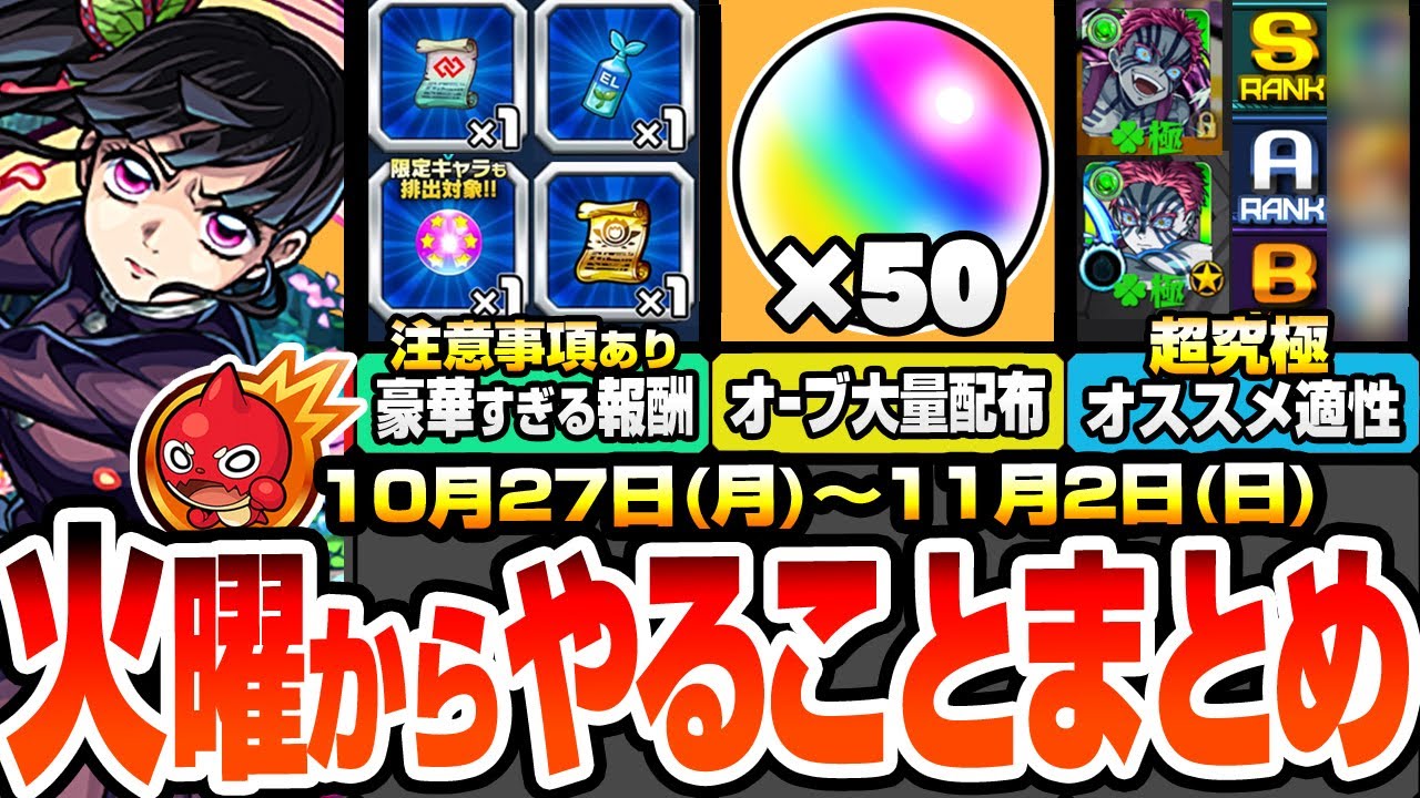 【モンスト】火曜からやることまとめ※超注意事項あり※大英雄の書やコネ書など豪華報酬の為に絶対やること!大量オーブ配布!超究極適性まとめ!周回すべき降臨とキャンペ【鬼滅の刃コラボ】へっぽこストライカー